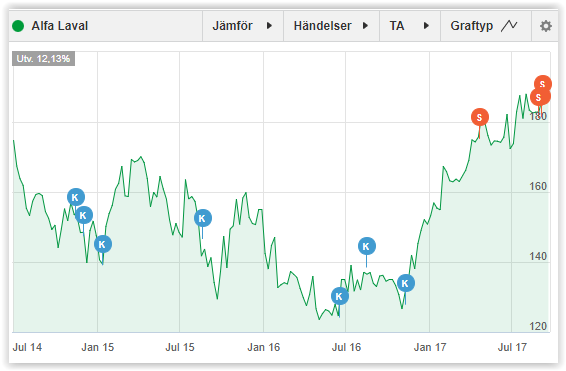 Alfa Laval har som jag skrivit på PA nyligen stora krav på sig precis som flera andra industribolag på börsen. Jag har därför successivt sålt mina aktier med god vinst. Kapitalet har jag placerat i andra innehav, bland annat Xact Högutdelande där Alfa Laval och Atlas Copco ingår, så kursen får fortsätta upp om den vill. Värderingen och direktavkastningen lockar mig däremot inte så mycket att jag vill behålla aktien.