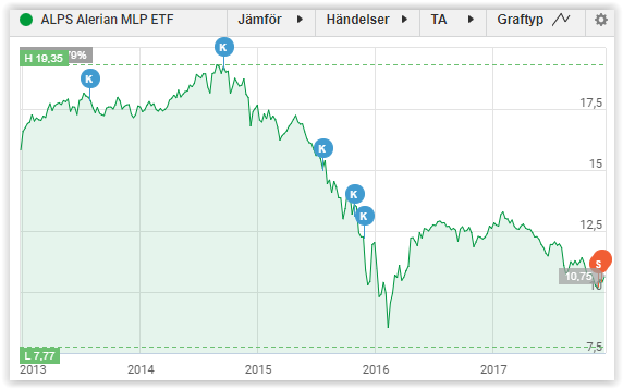 För en tid sedan sålde jag även ut fonden Alerian MLP ETF. Detta då kurstrenden vände nedåt igen, bland annat för att utdelningen har sänkts under 2017. När de trenderna bottnar kan jag överväga att köpa tillbaka denna skifferoljefond igen. Direktavkastningen är fortfarande hög, men av en anledning. Jag gick kursen Kavastutrender tidigare i höstas och nu tillämpar jag lite mer trendföljande investeringsfilosofi på detta innehav.